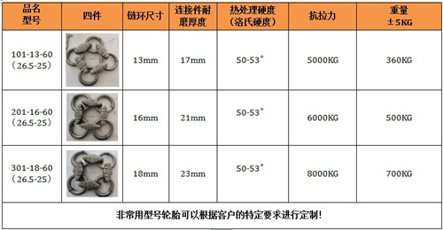 保養鏈耐磨性好,抗疲勞性強,根據使用條件壽命達3000-8000小時。拆裝方便,省時省力,產品規格齊全,可與進口裝載機所匹配,輪胎保護鏈,采用高科技耐磨材料制成其結構新穎緊湊,性能穩定,主要適用于礦山作業的裝載機,其輪胎磨損快,使用壽命短,輪胎價格昂貴,使用成本高,將本產品嚴密的包裹在裝載機的輪胎上,可以有效的保護裝載機的輪胎,不被尖銳的石塊劃傷刺破,延長了輪胎的使用壽命,使用一條輪胎保護鏈,能節省十條輪胎以上的費用還能提高裝載機的工作效率和安全是礦山作業的必備品。